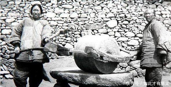 第三张晚清老照片:这是一家普通百家家的婆婆与儿媳妇,同样是小脚,一起用碾子在磨面。