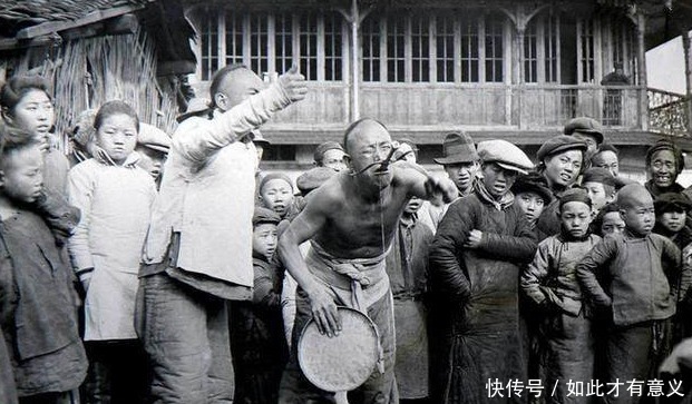 第六张晚清老照片:这是在街头表演的杂耍艺人,他们往往以损害身体为代价,博得身边围观群众的眼球,然后获得赏钱,看上面那个男人的行为很是让人心疼。