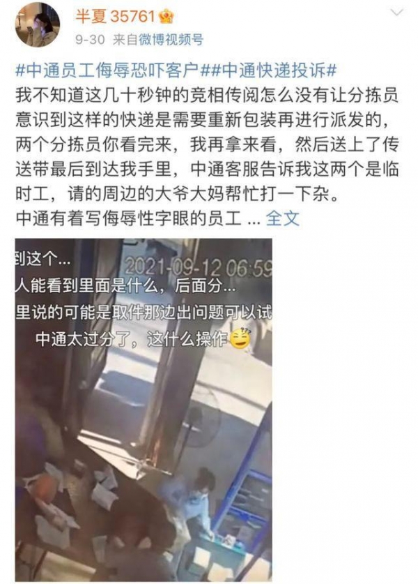 @半夏35761 猜测在进入分拣前盒子上就已经被写上了侮辱留言,两名分拣员很可能是在看留言,而这两名工作人员都没有对快递的异样进行上报等处理,中通客服则称俩人系周边请来打杂的临时工大爷大妈。