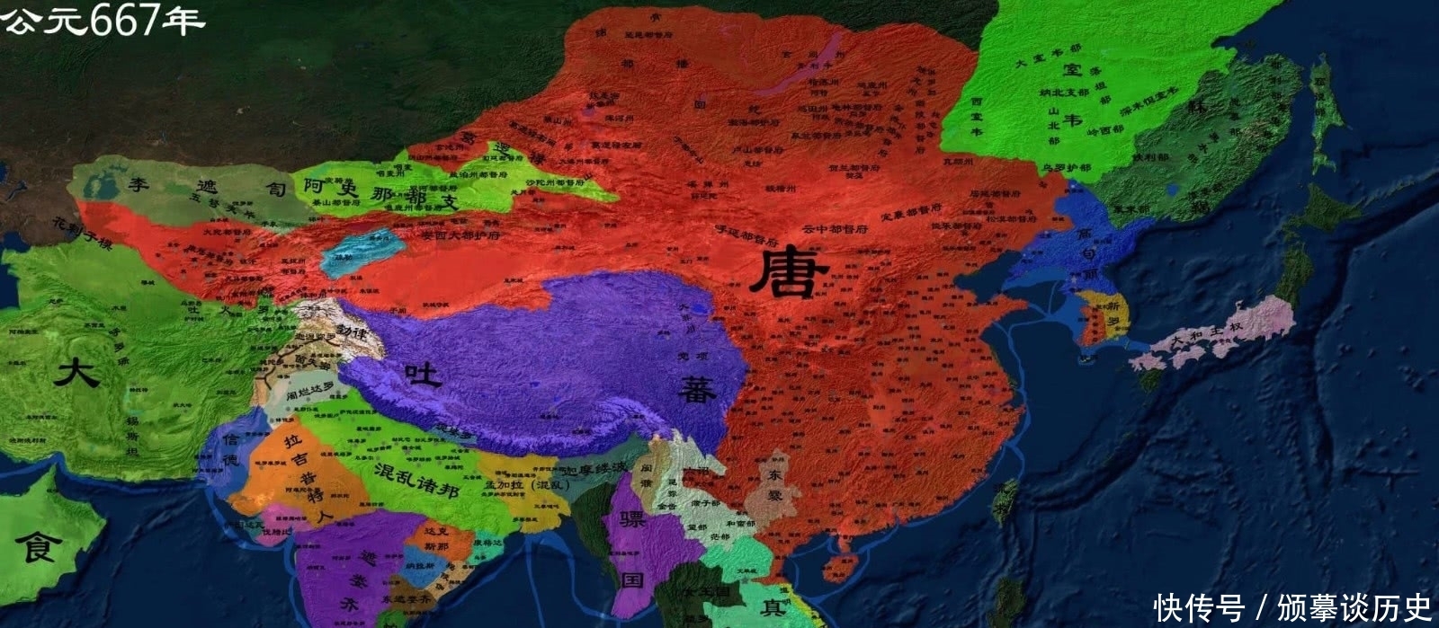 具体的说,就是西面达到了咸海,往东都是大唐的旗帜,直到辽东半岛(部分达到太平洋),北面贝加尔湖附近,往南全是。