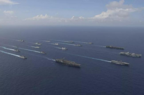 参加演习的6国舰队在琉球群岛附近举行阅兵