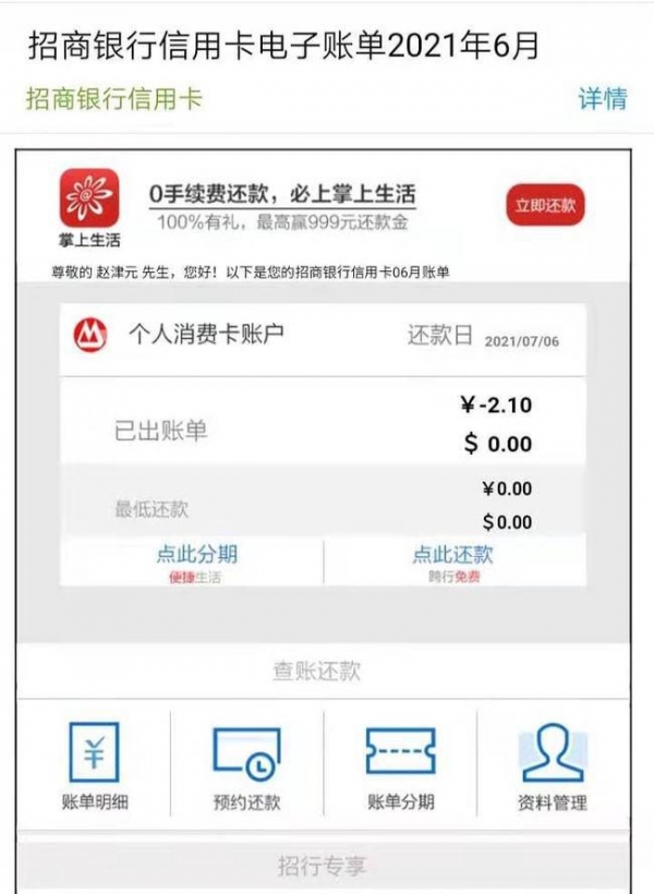 谁知,此后的 4 月、5 月、6 月和 8 月,赵先生又接连收到信用卡账单。分别为 -1.5 元、0 元、-2.1 元、0 元。