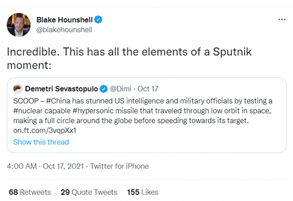 英国《金融时报》网站10月16日独家整了一个大新闻,中国在8月份试射了一枚高超音速武器。在推特上,西方媒体和“专家”们进一步分析称,这种高超音速滑翔飞行器由一枚长征2C型火箭秘密发射入轨。但和以往不同的是,这枚导弹先是进入轨道以后进行“环绕地球”飞行,随后再重返大气层进行“高超音速滑翔”,不过最终战斗部落在距标靶二十余英里(约合30多公里)处。