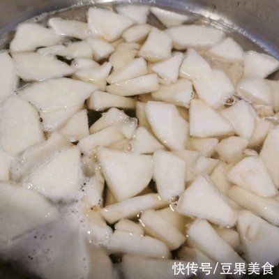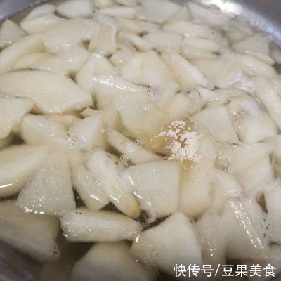 6、倒入梨子,煮开
