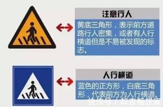 第四组标志是注意行人和人行横道两个标志的形状不一样。黄色背景的是警告和注意。人行横道是蓝底的方框,上面有白色的三角形状。两组标志都提醒机动车辆,注意躲避行人在有需要的时候停车让行或减速慢行。