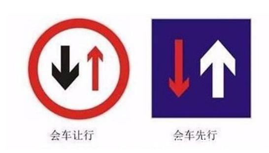 第三组是会车让行和会车先行。可以从颜色上区分,会车让行是一个圆形的红色圆圈标志,而会车先行是蓝底方框标志。此外,可以通过箭头的粗细来区分是让行还是先行。只要记住,与粗箭头方向相同的一方,车辆可以先行,就不会出错了。此组标志一般出现在道路变窄的路段,需要注意。