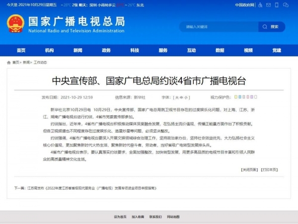 约谈指出,近年来,4省市广播电视台积极推动媒体深度融合发展,在弘扬主流价值观、传播正能量方面作出了积极贡献。但各卫视频道也不同程度存在过度娱乐化、追星炒星等问题,必须坚决整改。