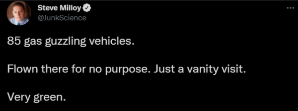 另一位评论员米勒讽刺:“85辆高耗油汽车。毫无目的到那里。就是一次充满虚荣的访问。非常‘环保’。”