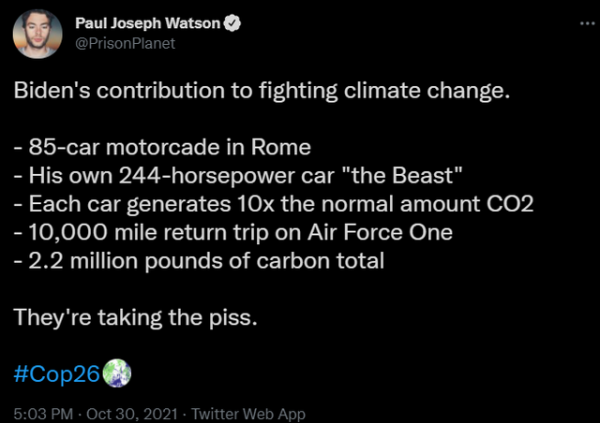有人给他算了笔账:“:“(下面是)拜登对抗击气候变化的贡献:①在罗马的85辆汽车车队;②他自己的244马力‘野兽’专车;③每辆车碳排放是正常水平的10倍;④空军一号10000英里的回程路途;⑤总计220万镑碳排放。他们这是在开玩笑。”