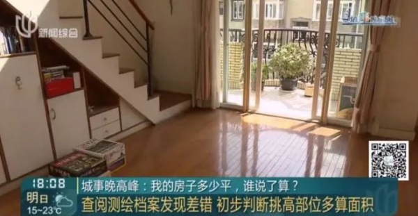 通过翻阅这套房子原始的房产测绘档案,交易中心还真发现了差错。初步判断,可能是当时房屋客厅挑高部位和露台部分多算了建筑面积。