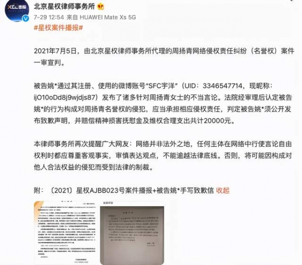 不过正义或许会迟到,但永远不会缺席,此前周扬青也因为被网暴名誉受损,后来直接给网暴的人发去律师函,最终键盘侠受到了应有的惩罚。