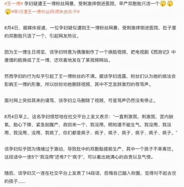 其实娱乐圈网络暴力事件每天都在发生,饭圈粉丝为了维护自家偶像,只要看到不利于偶像的评论,就会想尽一切办法发动网络暴力,而且也有很多网暴事件对当事人造成了巨大伤害。前段时间王一博的粉丝就对一位孕妇展开网络暴力,后果也是非常可怕。
