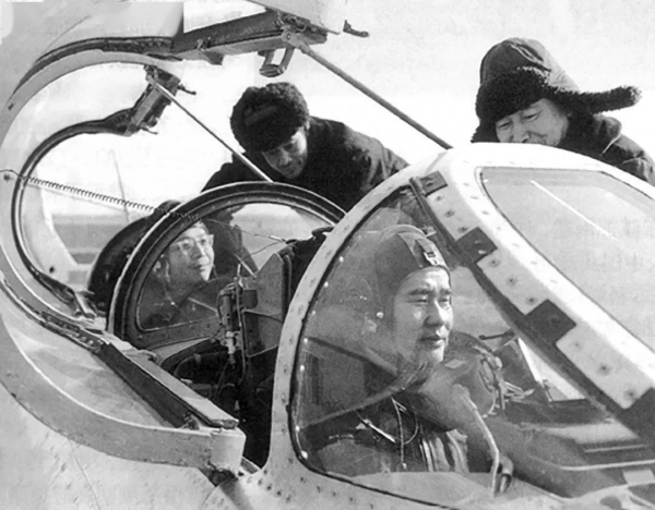 顾诵芬(后座)与鹿鸣东在歼教-6飞机上