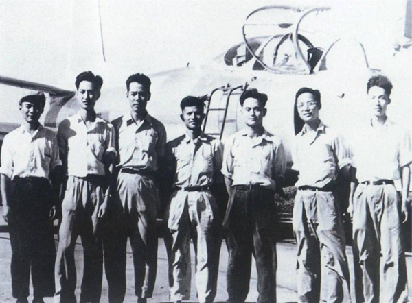 在歼教-1飞机前合影(左起:陆孝彭、叶正大、徐舜寿、王汇青、程不时、顾诵芬、汪子兴)