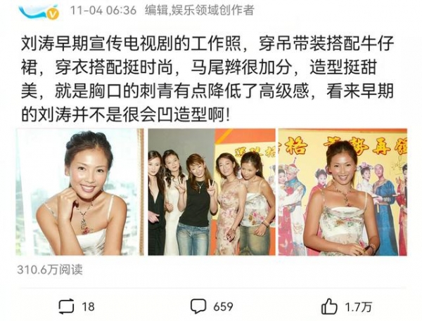 11月4日,有一位娱乐博主在网上晒出了一组刘涛早期的工作照,并配文“刘涛早期宣传电影的工作照,穿吊带装搭配牛仔裙,穿衣搭配挺时尚,马尾辫很加分,造型挺甜美,就是胸口的刺青有点降低了高级感,看来早期的刘涛并不是很会凹造型啊”,这一组刘涛早期的工作照火了,刘涛身上的刺青成了网友们关注的焦点。