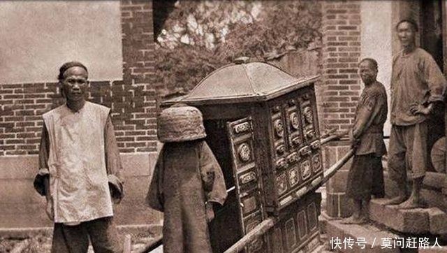 这是晚清一个女子出嫁的场景,头上扣着一个大盆,而且行走的时候也没人搀扶。让人看着有点摸不着头脑,不过这是当时的一种习俗。