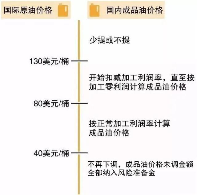 当国际原油价格发生暴跌或暴涨到一定程度时,国内成品油价会受到"天花板"和"地板"的限制。国际原油价格上限为130美元/桶,下限为40美元/桶。