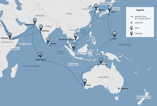 几经查询后发现,原来这次“巴伐利亚”号的亚太之行选择了一条相当意味深长的航线——从印度洋南下直扑澳大利亚,然后再北上访问关岛、日本和韩国,然后从台湾东侧海域南下,最后在返航途中计划穿过南海,选择马六甲海峡重新回到印度洋。