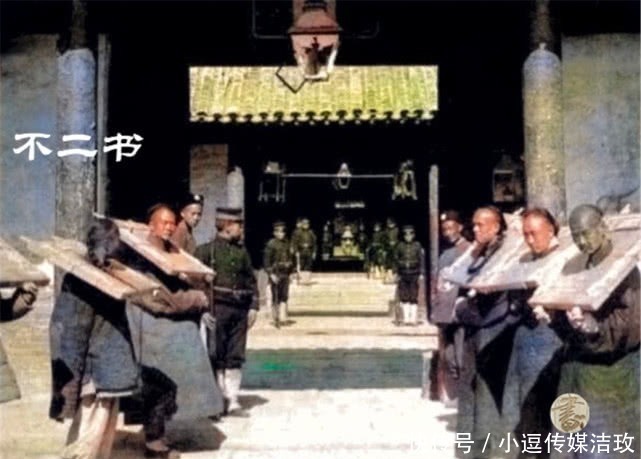 照片拍摄于清末时期,镜头下真实的死刑犯,他们头戴刑枷,我们可以看到,照片中的衙役还穿着清朝旧式的服装,而持枪械的士兵则已经改制成了新军的军服。