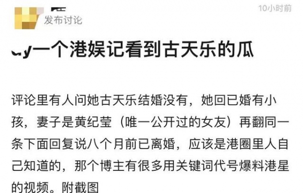 两天前,一位网友在评论区问起了古天乐的感情状况,没想到该娱记语出惊人,直接曝出古天乐已经隐婚生子的消息,称古天乐结婚的对象是黄纪莹,两人还有一个10岁的儿子。