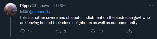 还有人批评起太平洋岛国的近邻澳大利亚:“这(一幕)是对澳大利亚政府的又一项严重和可耻的指控,他们抛弃了近邻和我们的社区。”