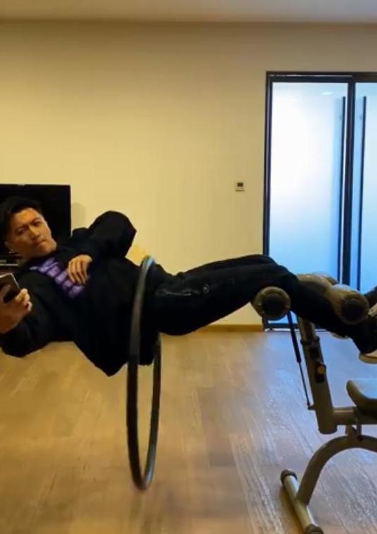 于是,谢霆锋马上开始了他的挑战。他用双腿勾住健身器材,然后把上半身悬空慢慢向后躺平,在他的腰间还有一个呼啦圈,随着身体稳定后,他居然直接晃动腰部,开始转起了呼啦圈。
