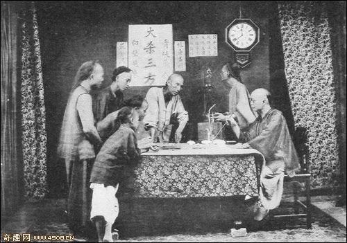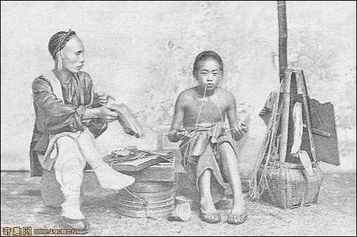 图为售卖高丹丸散.专治疑难杂症.跌打损伤的街头江湖医生。约1870年摄(同治九年)