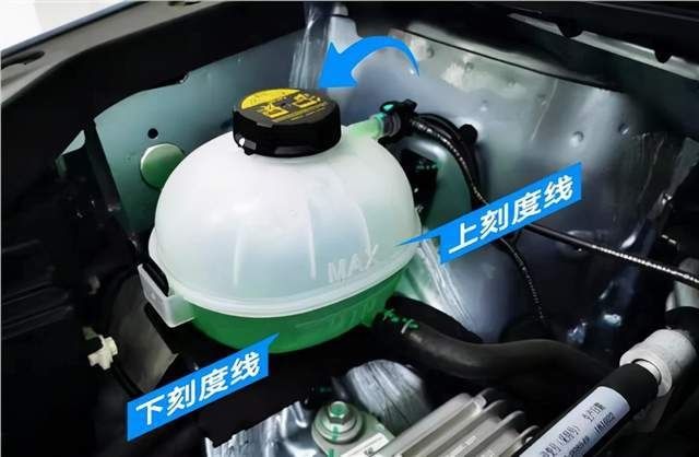 4、加注新的防冻液,加注至液面在max和min水位刻度之间位置即可。