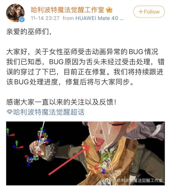 14日晚,《哈利波特:魔法觉醒》工作室微博账号@哈利波特魔法觉醒工作室(粉丝2.5万)回应称,女性巫师受击动画异常系BUG,因为舌头未经过受击处理,错误地穿过了下巴,正在修复这一异常。