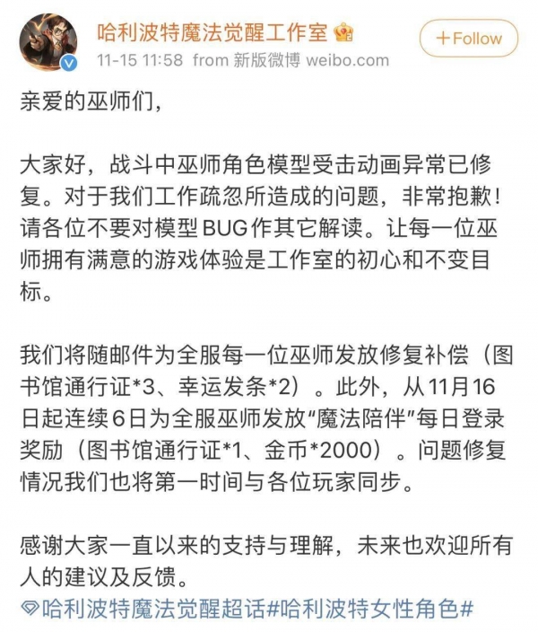 15日,@哈利波特魔法觉醒工作室 再度回应称,动画异常已修复,希望大家不要对模型BUG作其它解读,并称会为全服每一位巫师发放修复补偿。