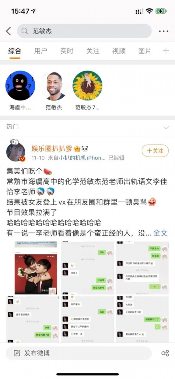 这两天网上热搜突然出现了“常熟海虞高中化学老师范敏杰出轨语文老师李佳怡”的瓜,笔者不明就里,于是点击看了一下,不想又是一出男女搞对象女方发现男的有其他女人之后用男人的手机发朋友圈自述乱搞的经历的瓜。