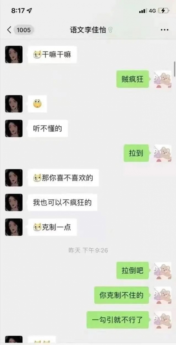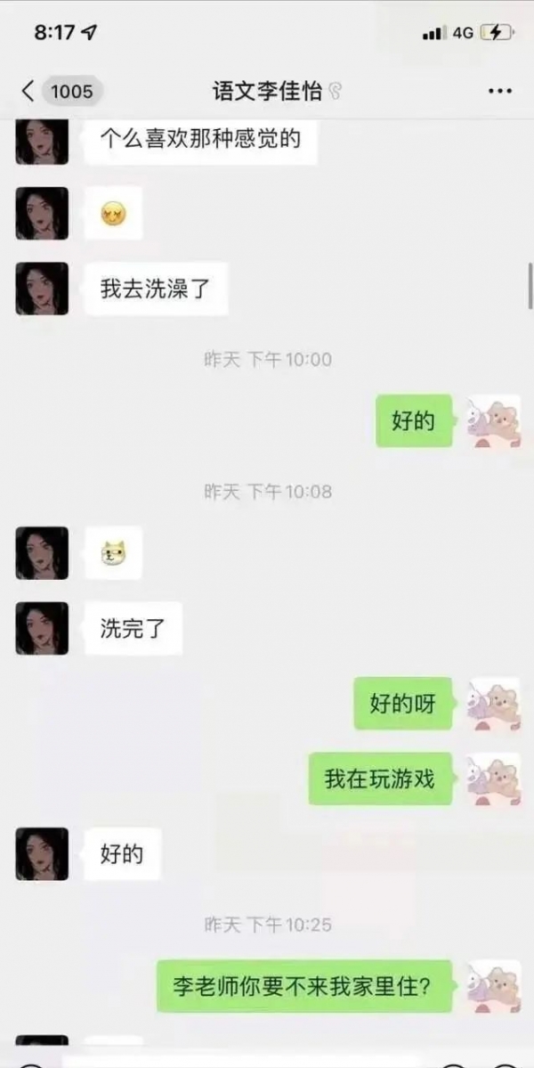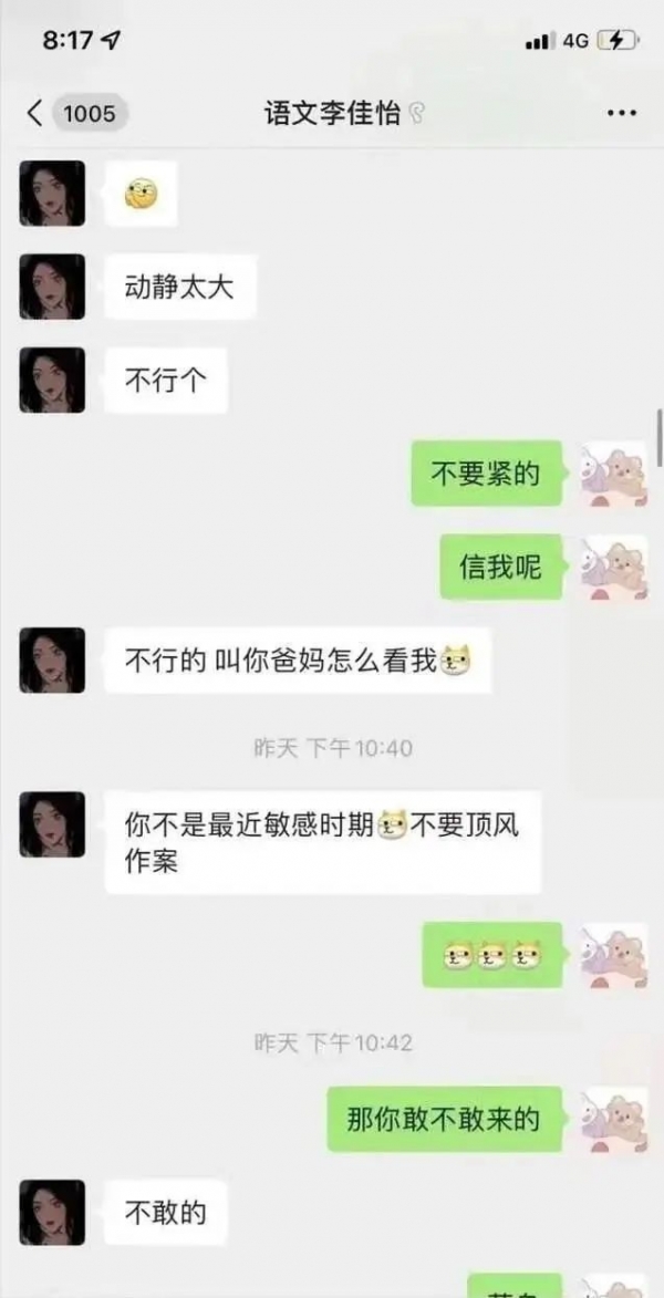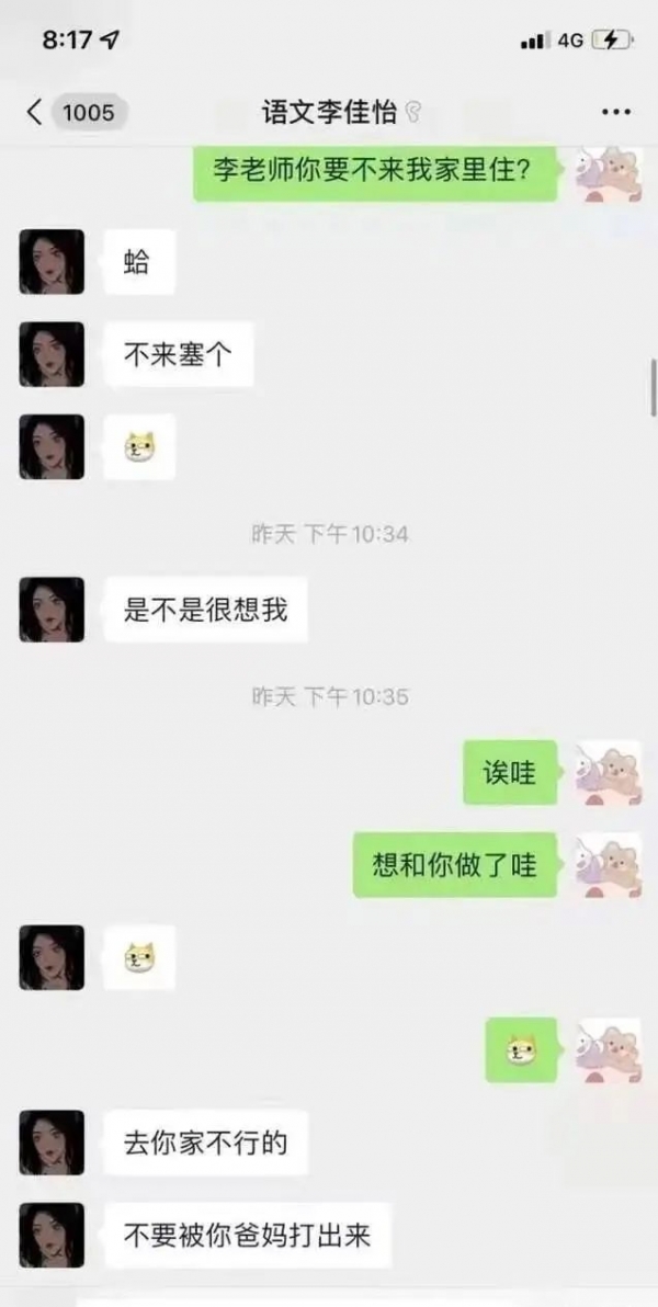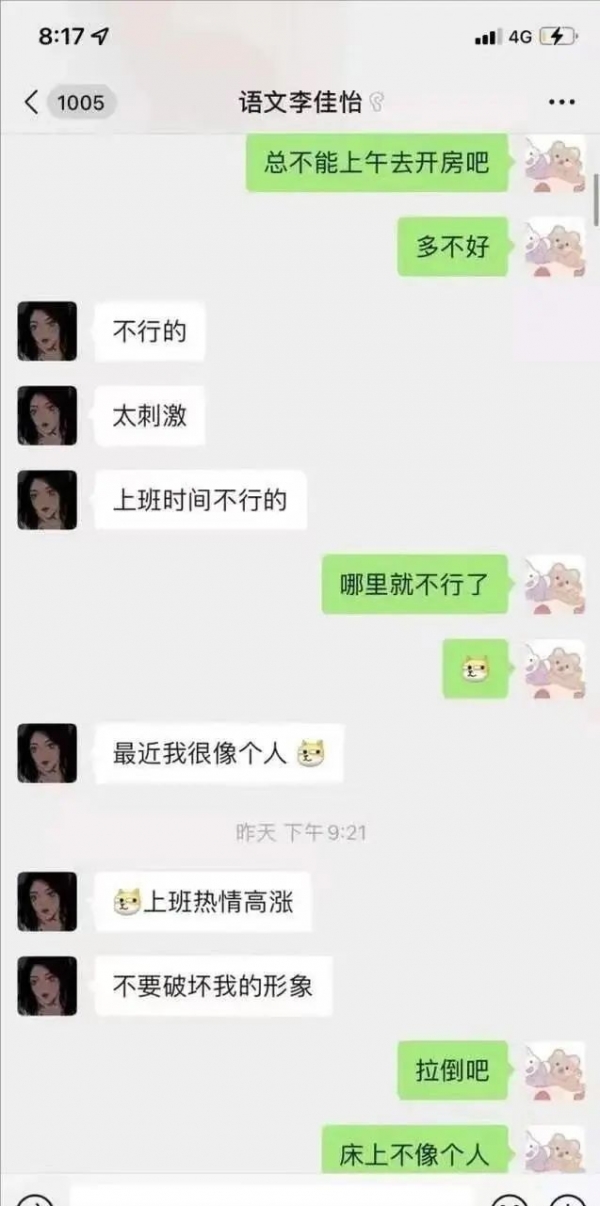 朋友圈中女方还把语文老师李佳怡的照片给发了出来,从照片中我们可以看到李佳怡的长相算是中上。但这还没完,就在女方用范敏杰的手机发完朋友圈之后,不知道又用了什么渠道,将范敏杰和李佳怡两人的私密聊天记录发了出来,该聊天记录双方你侬我侬,语气十分暧昧,让人看后不禁有些脸红心跳。不过这也正常,因为小年轻日常打情骂俏语言奔放了一些一点也不奇怪,他们哪能想到有一天这些聊天记录会被公之于众。