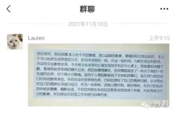 各位领导,各位同事:本人对今天的事情,致以诚挚的歉意,事情的经过是这样的,本人于10.1和前女友吵架后分手,后与李老师在一起。在这一段时间,与前女友还有联系,并没有完全断绝关系,今天前女友来我办公室发现我手机在办公桌上,她就拿起来翻了翻,看到我和李老师的聊天记录,然后就事情爆发,在同事群里发了一些关于我的一些负面的信息,对于我十分惭愧,因为个人原因影响到了学校和同事们。现在我与前女友已经彻底断绝来往,并且也会对李老师负责,已经处理好了自己的情感问题。从中我也对自己的情感生活进行检讨,作为一名老师,没有以身作则,做好榜样,在自己的私生活中犹犹豫豫,藕断丝连,不仅仅对前女友而且还有李老师造成了伤害,对此我表示十分的歉意,并且保证在后续工作中进行自我约束。
