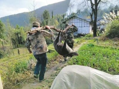 11月8日,通江县动物卫生监督所工作人员对捕杀的野猪用生石灰消毒,一层石灰一层土,就地挖深坑掩埋。其中被四个壮汉抬着的一头野猪,膘肥体壮,足有200斤以上。见肥美的野猪被埋,有网友打趣道:“这就是暴殄天物!”