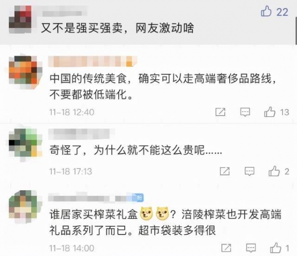 不过也有网友表示理解:“又不是强买强卖”、“中国传统美食确实可以走高端奢侈品路线,不要都被低端化”。