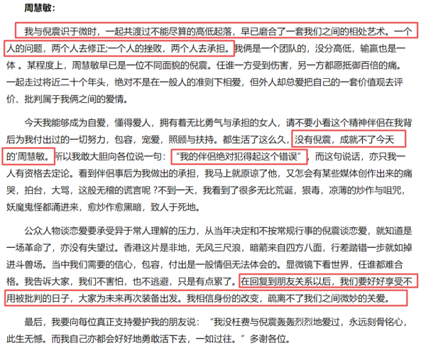 最后,她宣布自己和倪震分手,做回朋友,希望能享受不被批判的日子。