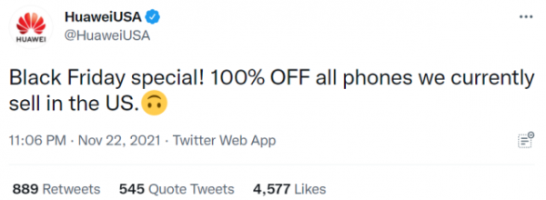 昨日晚间,华为美国通过官方 Twitter“宣布”了“黑色星期五”特价,并调侃称“我们所有美国在售手机享 100% 折扣”。