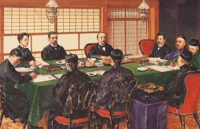 1895年3月13日,清朝直隶总督、北洋通商大臣李鸿章,奉命以头等全权大臣的名义,率领100多名随员前往日本马关,与日本首相伊藤博文、外务大臣陆奥宗光进行谈判。