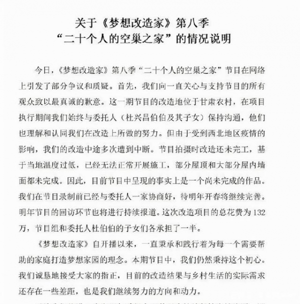 关于整个梦想改造家的事件,其实设计师与节目方也出来公开对舆论进行表态,那就是房子还没完全建设好,多次改造被中断了,所以大家看到的只是半成品的状态,希望大家可以理解。