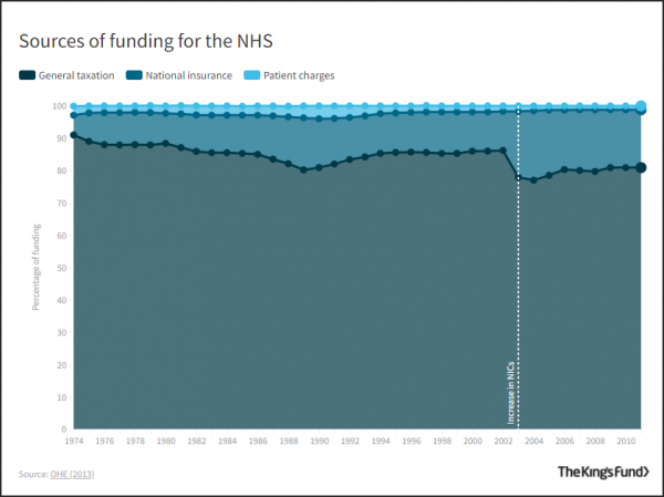 据独立智库“国王基金”(The King's Fund)介绍,覆盖全体国民的NHS的资金,主要来自国民一般税收,还有不到五分之一来自国民保险(NICs),只有极少数资金以处方费等形式向患者收取。从2003年4月开始,NHS中来自保险的比例加大,但绝大多数费用仍由税收覆盖。