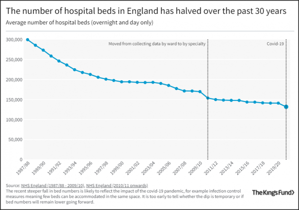 经BBC事实核查部门证实,从2010年到2019年,英格兰的NHS医院减少了1.7万病床,一半是综合性医院的病床。英国自从20世纪80年代开始,医院的病床数量就呈减少趋势。“国王基金”指出,过去30年,英格兰病床数量减少了一半。