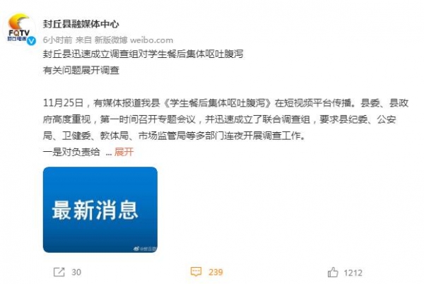 11月25日,有媒体报道我县《学生餐后集体呕吐腹泻》在短视频平台传播。县委、县政府高度重视,第一时间召开专题会议,并迅速成立了联合调查组,要求县纪委、公安局、卫健委、教体局、市场监管局等多部门连夜开展调查工作。