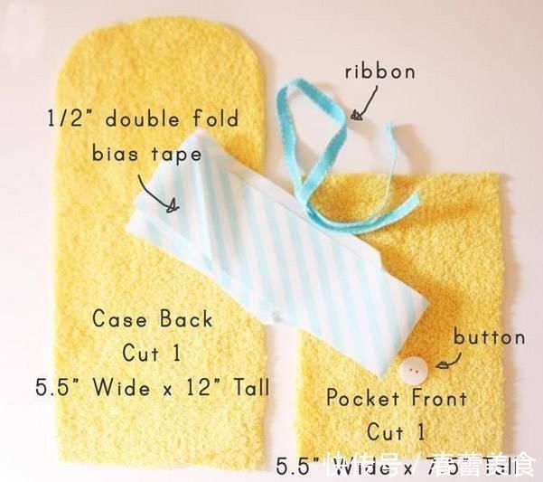 用毛巾布剪出一大片做底,一小片做前面的口袋。将上面两个角修剪圆润。做对折的边带。 ( 商店买现成的就不用了。 )