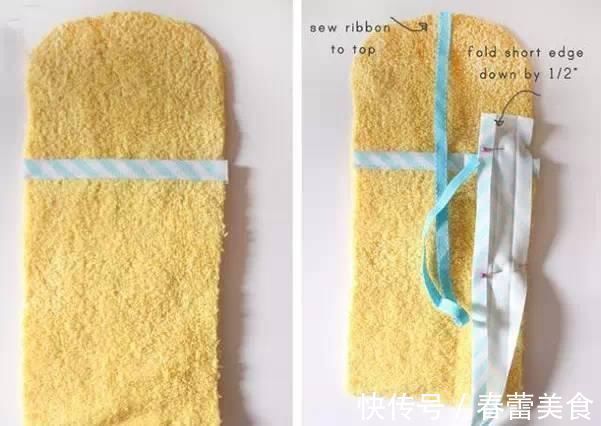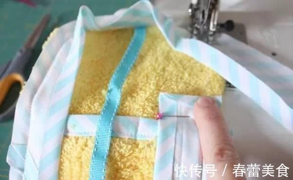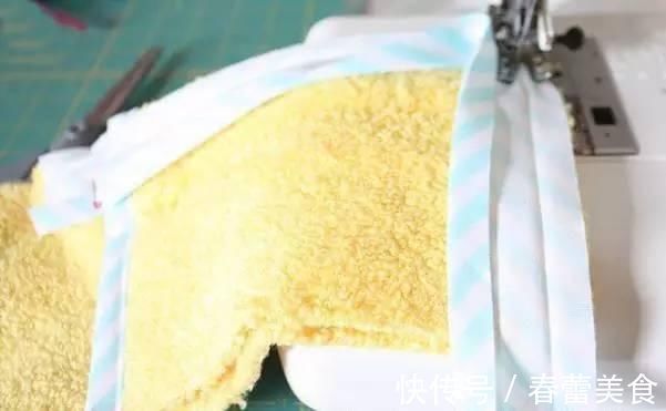打开斜纹布将反面钉在毛巾布上,沿着第一个折印缝好,尾端也要缝合。