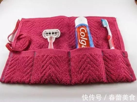 然后在毛巾的边缘缝上一个细布条,洗漱品收纳袋就做好了 ~