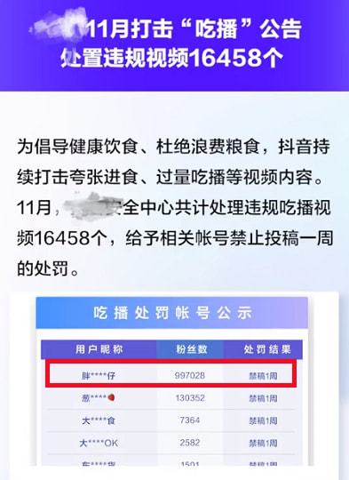 图片中可以看到,“胖猴仔”被平台封禁一周的时间,至于原因也非常明确,杜绝浪费粮食,严厉打击吃播浪费行为,“胖猴仔”的视频中国,其都会制作大量的食物,但是从来没有吃完过。