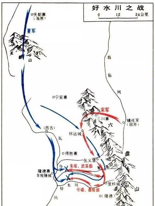 康定二年(1041),李元昊亲自率兵十万南下攻宋,大军直抵好水川。为了一举击败宋军换取宋朝放下身段和谈,李元昊精心布置了战术:他率主力埋伏在好水川口,而派分队前往怀远城诱敌深入,准备设伏围歼。