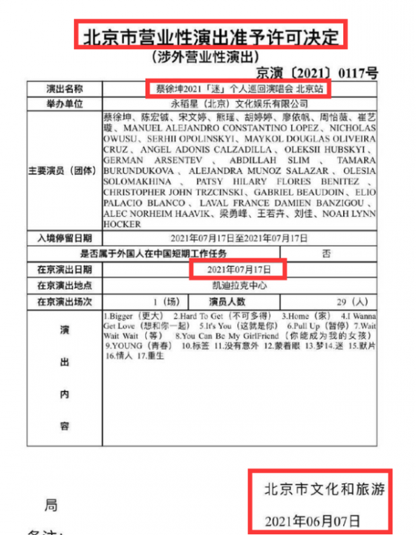 首先,演唱会是准许下举办的,倘若拿不到演出许可证,蔡徐坤演唱会根本不会通过审核。粉丝也晒出了演出许可证,证实蔡徐坤是在拿到许可证的情况下举办的演唱会。