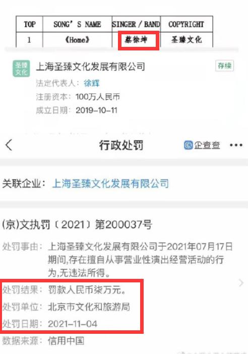 为此有网友经过考证,查明了蔡徐坤北京站演唱会的代理公司,即“上海某某文化发展有限公司”,从相关信息来看,该公司的确被处以7万元的行政罚款,信息上也明确表明公司承接的是艺人蔡徐坤的演艺活动,被罚单位即北京文旅部,处罚日期是2021年11月4日,所有的信息与通报中的信息完全一致,可以确定通报中的“蔡某某”就是蔡徐坤。