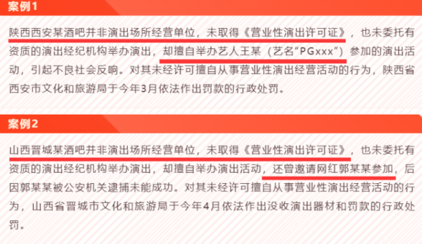 从文旅部发布的通报中还可以得知,除了文中所指的蔡某某之外,PGOne和郭MM也被点名通报,两人同样存在未经许可擅自从事营业性演出的行为。